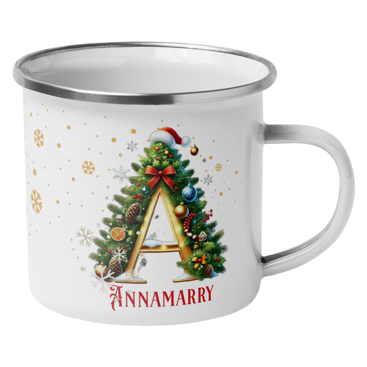 Custom Christmas Enamel Mug with Letter and Name | Personalized Holiday Mug | Hot Cocoa Cup