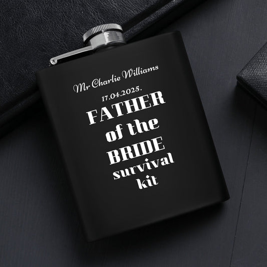 Father of the Bride Survival Kit – Personalized 7oz Black Stainless Steel Flask Set with Gift Box, Funnel & Cups