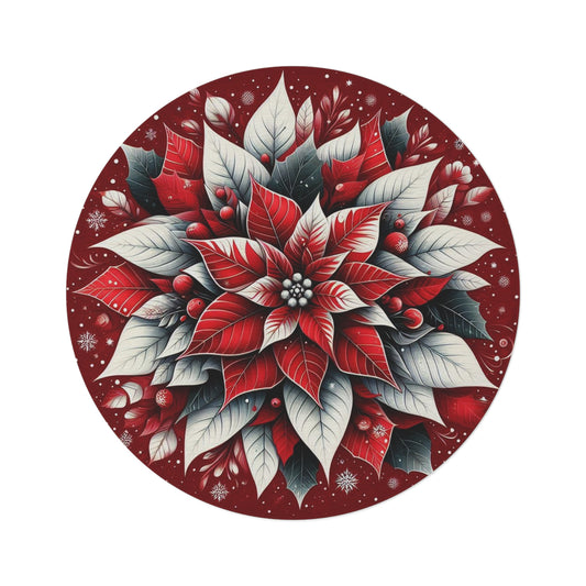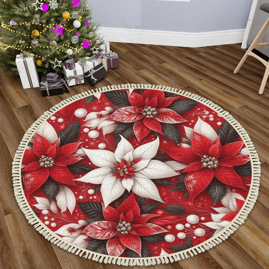 Christmas Round Rug, Holiday Poinsettia Home Decor, Festive Circle Carpet, Xmas Floral Area Rug, Winter Flower Floor Mat