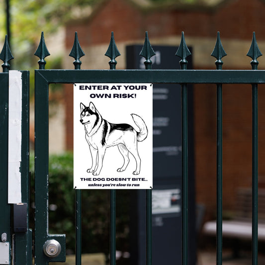 Husky Warning Sign – Funny Metal Guard Dog Sign for Fence or Gate | “Enter at Your Own Risk” Outdoor Pet Safety Plaque