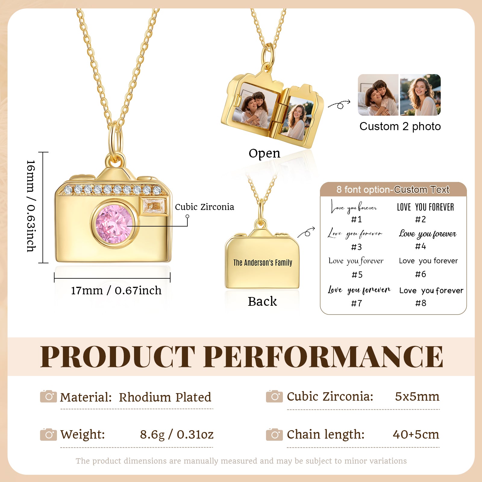 Crafted from durable brass with a sophisticated rhodium plating, this personalized birthstone and photo necklace combines timeless elegance with meaningful customization. The pendant measures 17×26mm and features a refined design that showcases your chosen birthstone and cherished photo. Available in two versatile models (NE80430601/NE80434401), it arrives on an adjustable 40+5cm chain, making it comfortable for various necklines. Weighing approximately 8.6g, this piece offers substantial quality without excess bulk—ideal for everyday wear or special occasions.